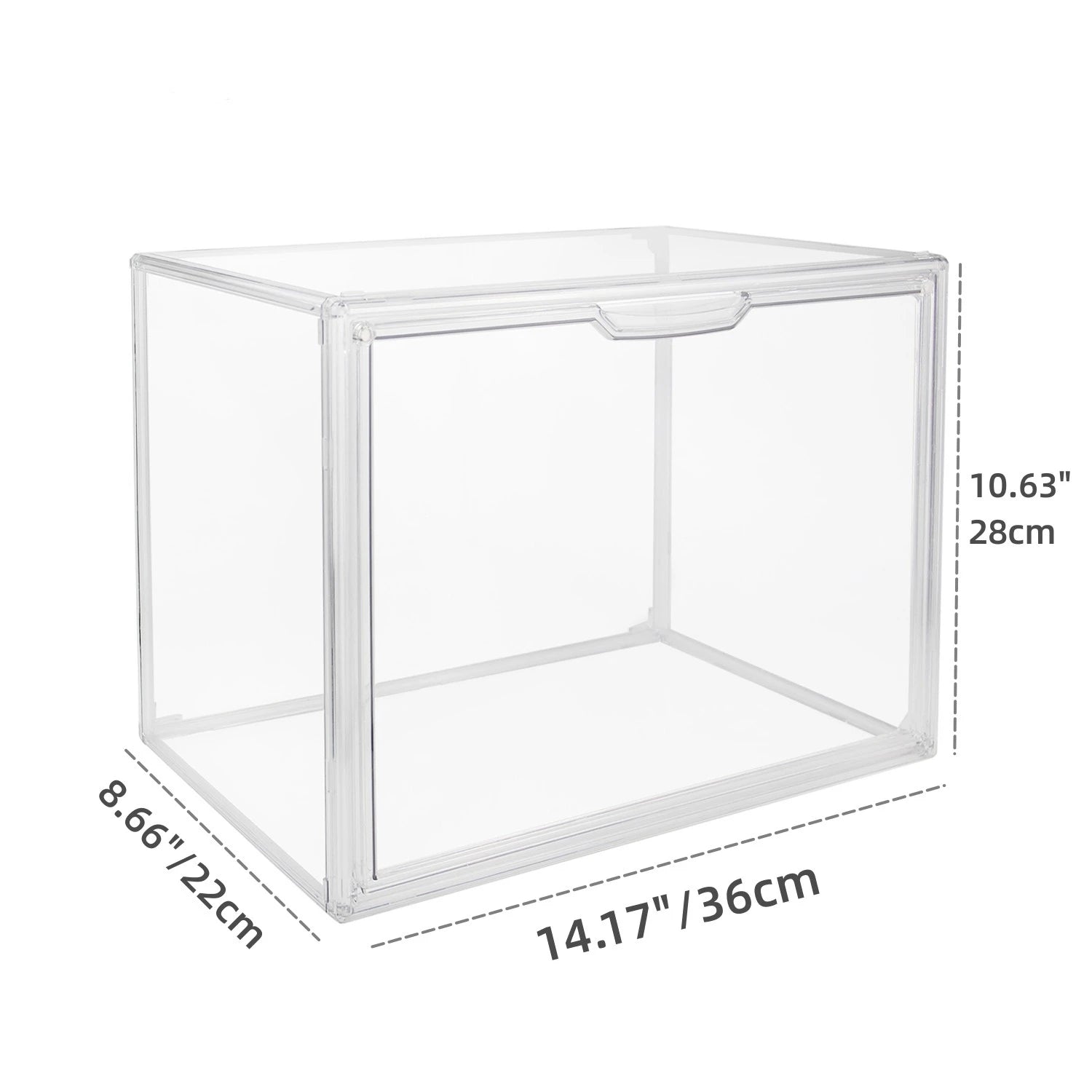 Large & Transparent: Each size 36x22x28cm, or 14.17”x8.66”x10.63”. The space of each clear display box is large enough for placing your handbag, with lid to keep your purse clean;The transparent design can ensure that your collection will be displayed from all angles.