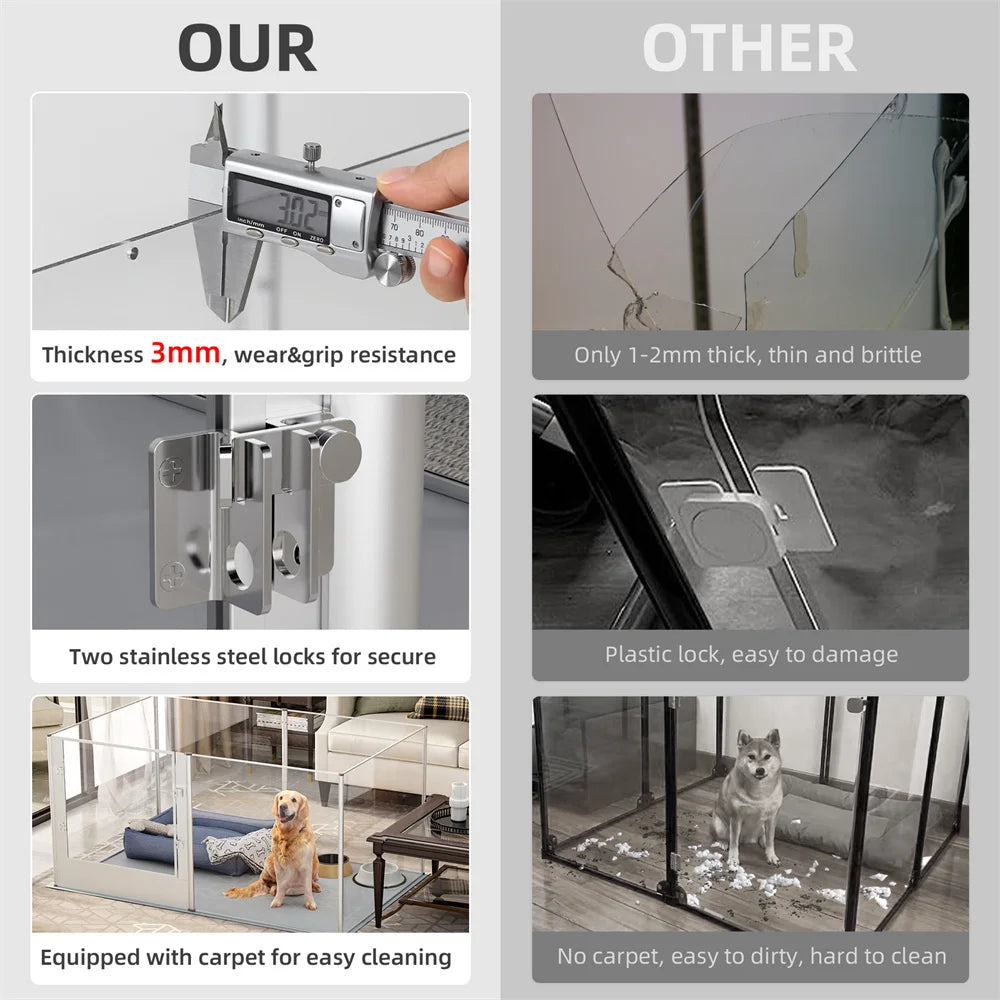 Use Breakthrough Materials: Barbed wire fences are easy to rust, and wooden fences are easy to be affected by moisture, we break through the traditional thinking and use a scratch-resistant acrylic panel with a thickness of 3.2mm combined with an anti-oxidation aviation aluminum frame to make a pet playpen, the splicing interface part adopts our patented technology, which is easy to assemble,with non-slip floor mat, it is not easy to move.